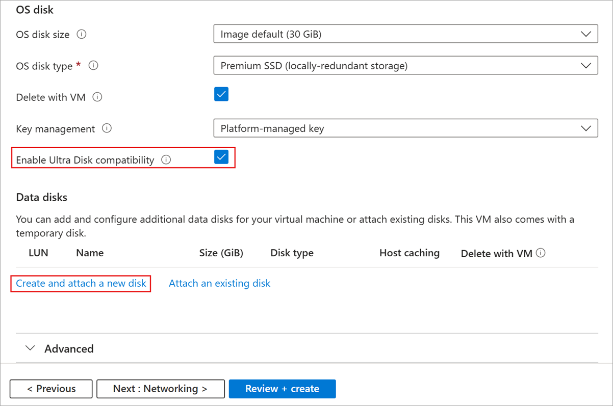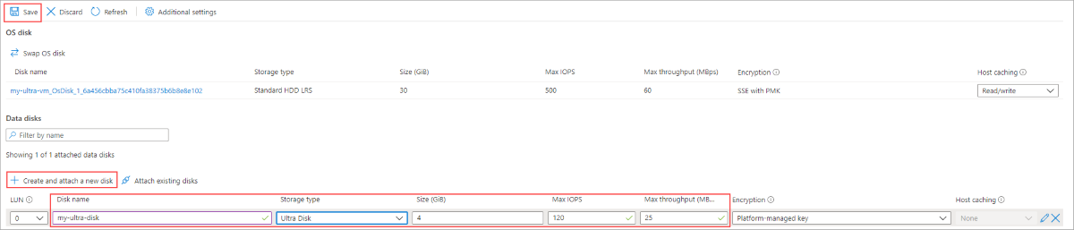 Válassza a Létrehozás és új lemez csatolása opciót egy Ultra Disk azonnali csatlakoztatásához.