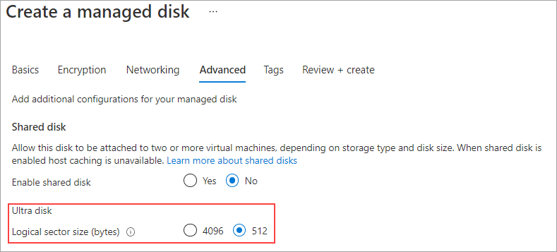 Az Ultra Disks alapértelmezés szerint támogatja a 4k fizikai szektor méretét, de támogatja az 512E szektorméretet is. A legtöbb alkalmazás kompatibilis a 4k szektorméretekkel, de némelyikhez 512 bájtos szektorméretre van szükség. Az Oracle Database például 12.2-es vagy újabb kiadást igényel a 4k natív lemezek támogatásához. Az Oracle DB régebbi verzióihoz 512 bájtos szektorméret szükséges.