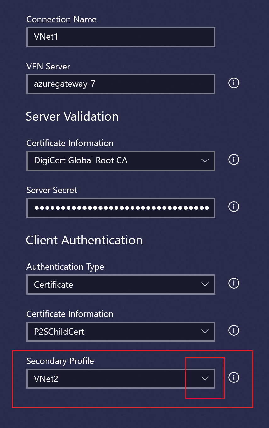 Az Azure VPN-ügyfél magas rendelkezésre állást biztosít az ügyfélprofilokhoz. A másodlagos ügyfélprofil hozzáadása rugalmasabb módot biztosít az ügyfél számára a VPN eléréséhez. Ha régiókimaradás vagy az elsődleges VPN-ügyfélprofilhoz való csatlakozás meghiúsul, az Azure VPN-ügyfél automatikusan csatlakozik a másodlagos ügyfélprofilhoz, és nem okoz fennakadásokat. Ehhez a funkcióhoz az Azure VPN-ügyfél 2.2124.51.0-s vagy újabb verziója szükséges.