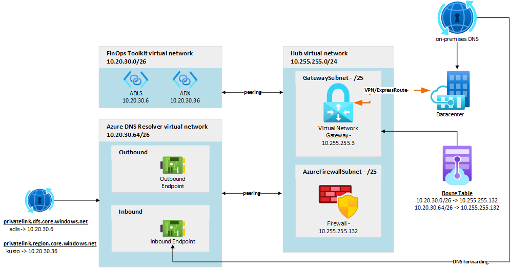 A FinOps Hub virtuális hálózat DNS-konfigurációjának módosítása nem ajánlott. A FinOps Hub-összetevők megbízható névfeloldást igényelnek az üzembe helyezésekhez és a frissítések sikerességéhez. A Data Factory-folyamatok megbízható névfeloldást is igényelnek az összetevők között.