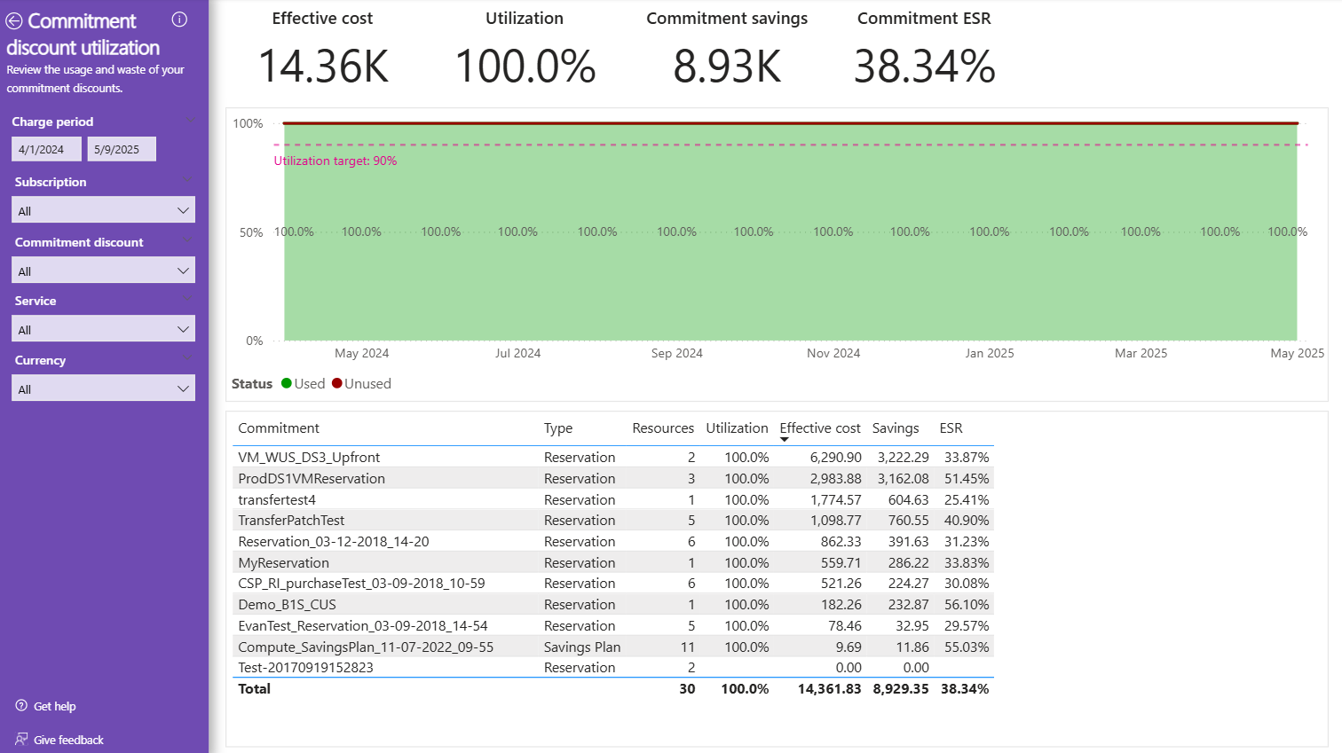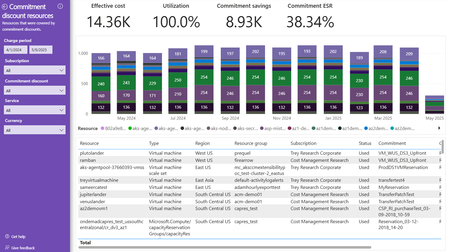 A diagram időről időre lebontja a kötelezettségvállalási kedvezmények tényleges költségét erőforrásonként. A táblázat a teljes időszak kihasználtságát, költségét és megtakarítását mutatja. Ha egyetlen kötelezettségvállalási kedvezmény erőforrásait szeretné megtekinteni a diagramon, állítsa be a megfelelő szűrőket a bal oldalon, vagy használja a "Részletezés" funkciót egy másik oldalról.