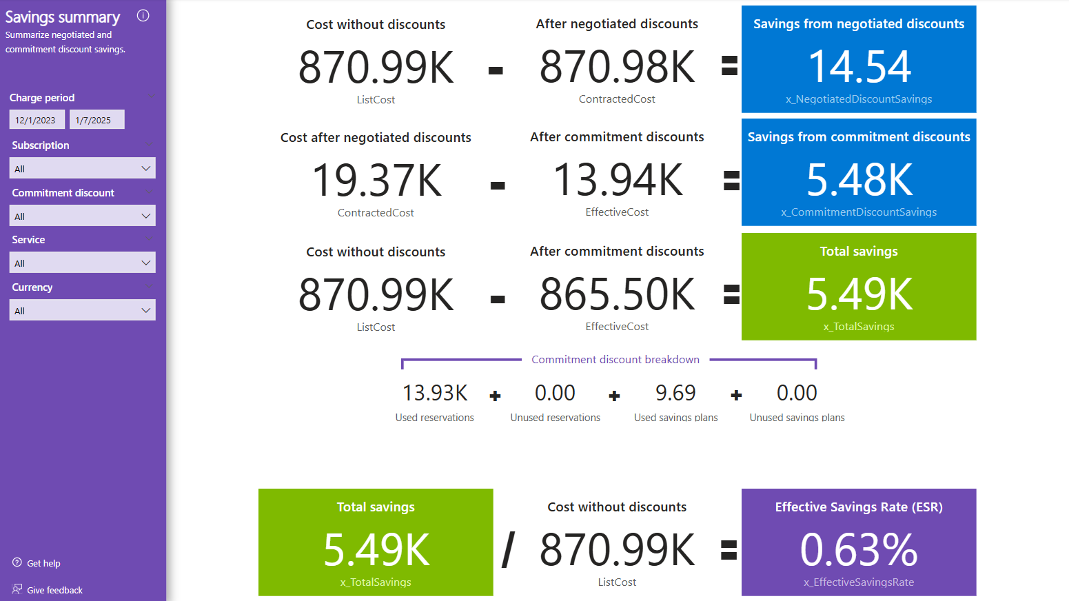 A Total savings (Összes megtakarítás ) oldal összegzi a egyeztetett és a kötelezettségvállalási kedvezményekből származó költségmegtakarításokat. A megtakarítások kiértékelése a listaköltség és a tényleges költség összehasonlításával történik, és tartalmazza az érvényes megtakarítási rátát (ESR), amely a listaköltséghez viszonyított százalékos megtakarítást mutatja.