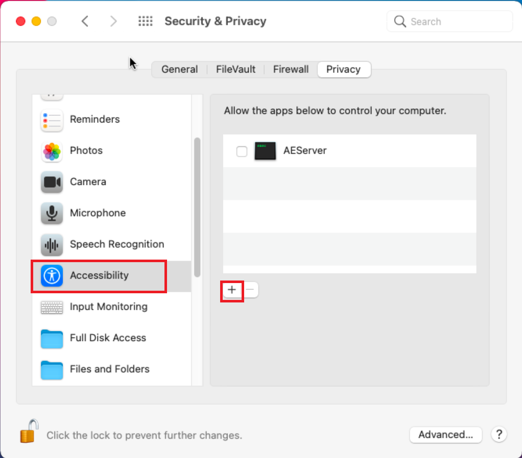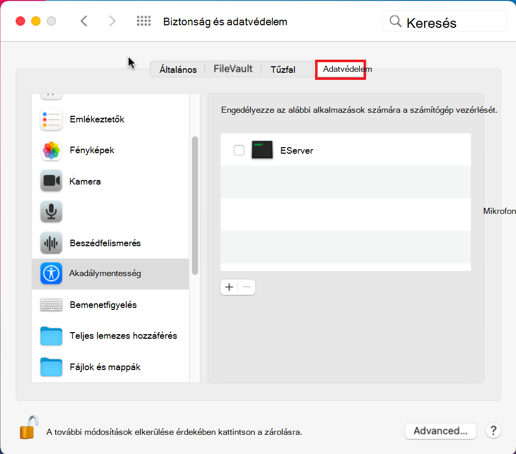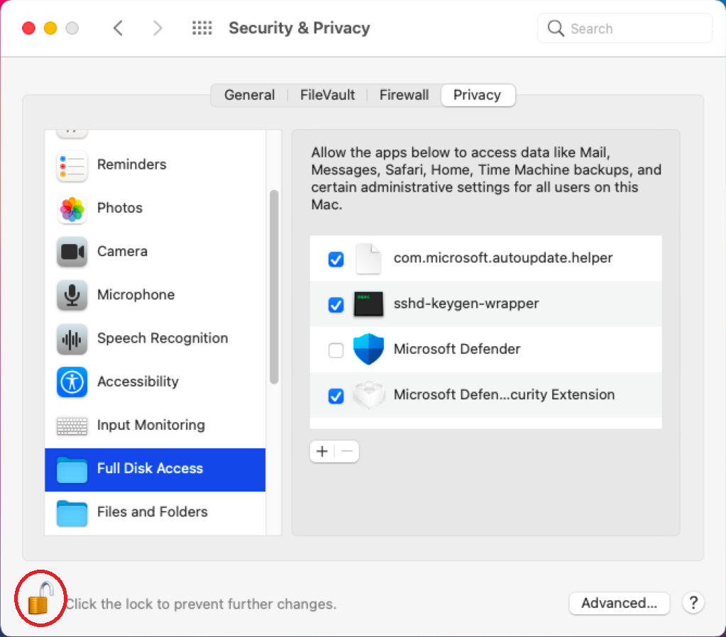 A bal oldali navigációs panelen válassza a Teljes lemezes hozzáférés lehetőséget, majd a Zárolás ikont.