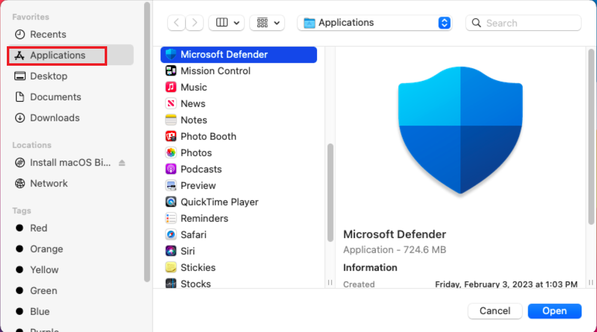 Az eredményként kapott képernyőn válassza az Alkalmazások lehetőséget a képernyő bal oldalán található Kedvencek panelen; válassza a Microsoft Defender lehetőséget, majd a képernyő jobb alsó sarkában válassza a Megnyitás lehetőséget.