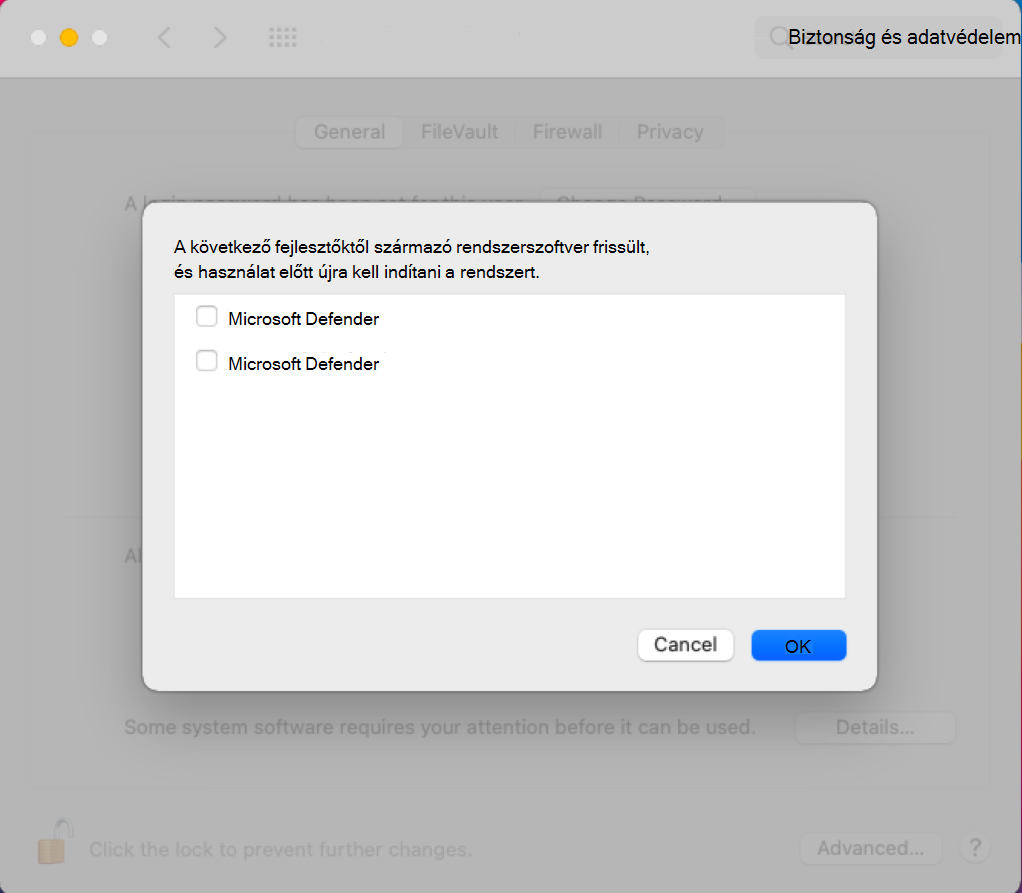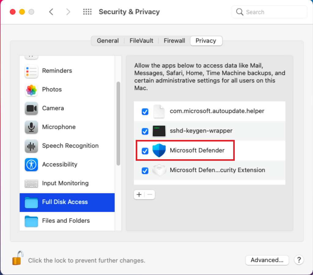 Győződjön meg arról, hogy a Microsoft Defender bővítmény teljes hozzáféréssel rendelkezik a lemezhez; ha nem, jelölje be a Microsoft Defender jelölőnégyzetet.