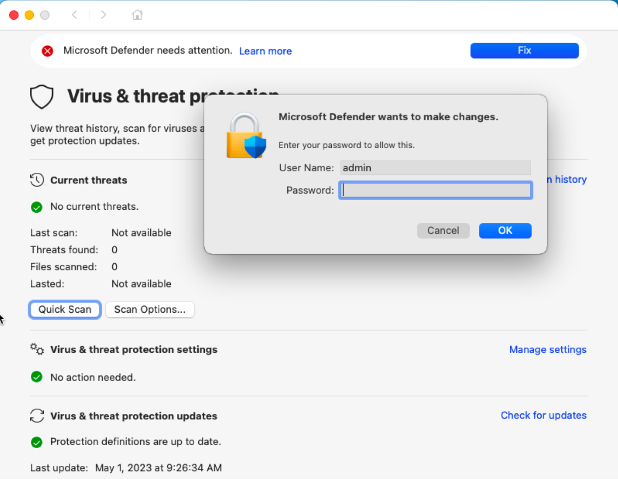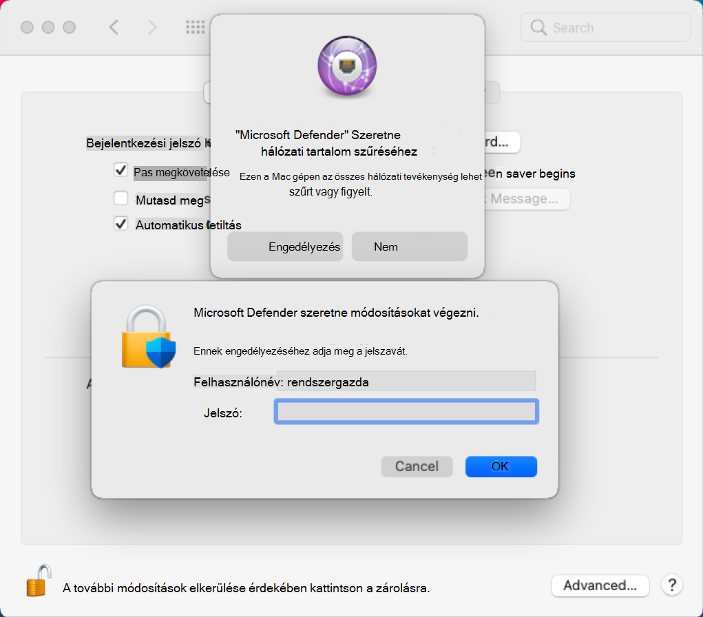 A Microsoft Defender módosítani szeretne előugró képernyőn adja meg a jelszavát, és válassza az OK gombot.