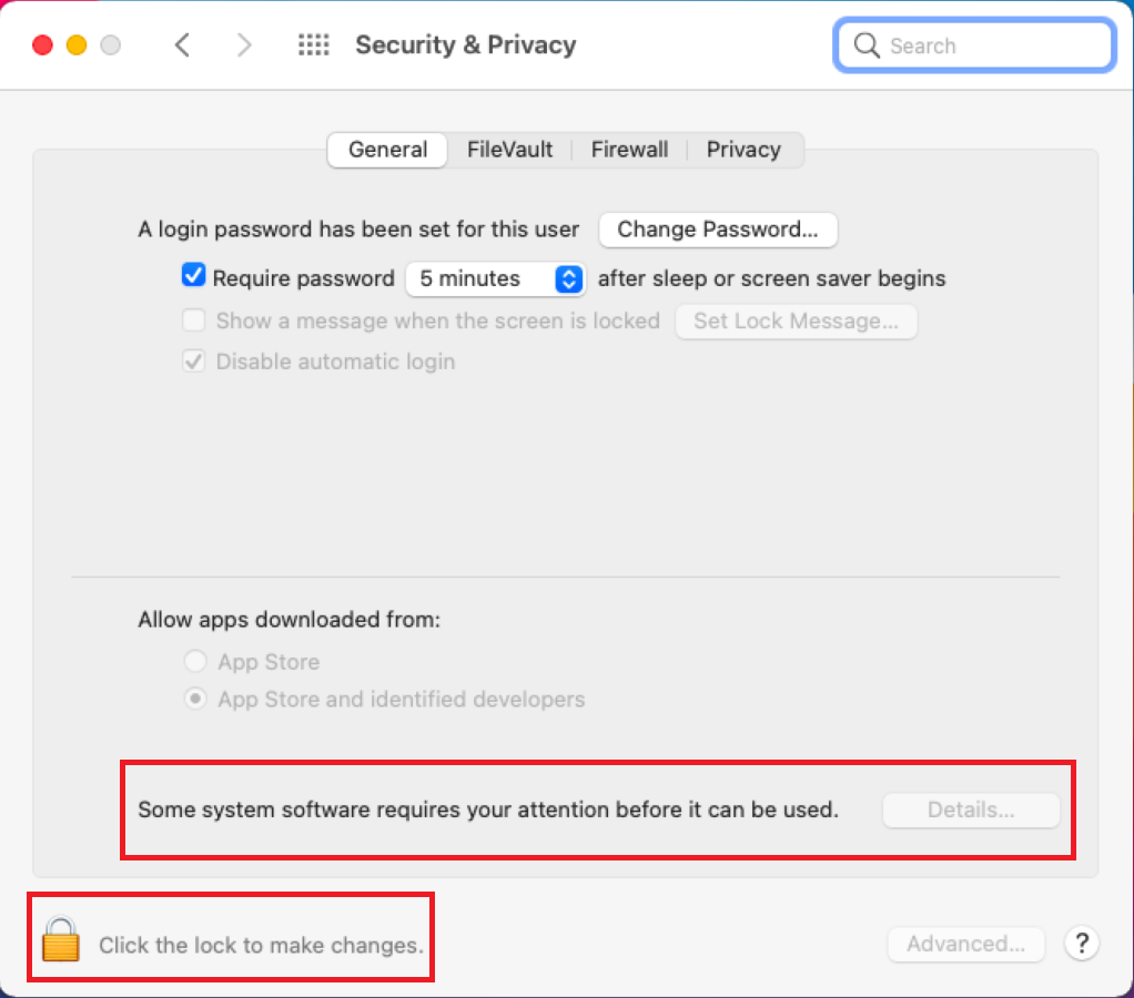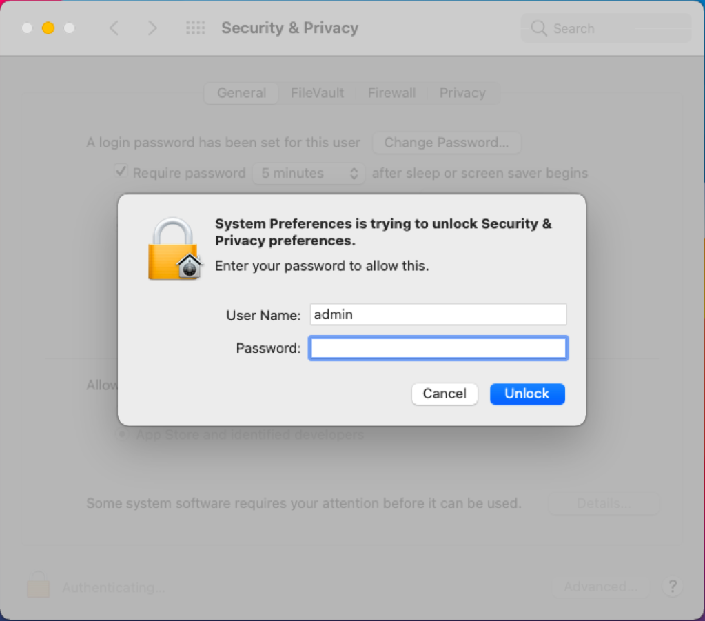 Válassza a Kattintás a zárolásra lehetőséget a módosításokhoz. A következő képernyőképen látható módon megjelenik egy üzenet: