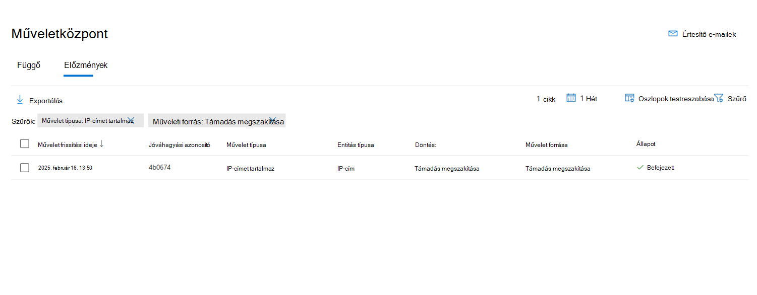 Miután tartalmazott egy IP-címet, megtekintheti a műveletet a Műveletközpont Előzmények nézetében. Láthatja, hogy mikor történt a művelet, és azonosíthatja a tartalmazott IP-címeket.