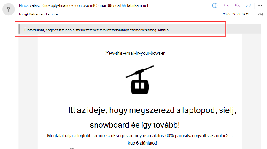Tartomány megszemélyesítésének biztonsági tippje: A Feladó cím egy tartomány megszemélyesítés elleni védelemben megadott tartományt tartalmaz. Csak akkor érhető el, ha a Tartományok védelmének engedélyezése be van kapcsolva és konfigurálva van.
