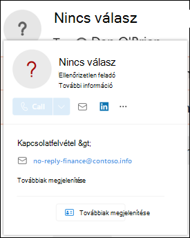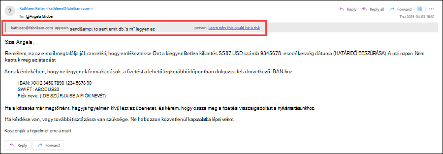 Felhasználói megszemélyesítés szokatlan karaktereinek megjelenítése biztonsági tipp: A Feladó cím szokatlan karakterkészleteket (például matematikai szimbólumokat és szöveget, illetve kis- és nagybetűk kombinációját) tartalmaz a felhasználói megszemélyesítés elleni védelemben megadott feladóban. Csak akkor érhető el, ha a Felhasználók védelmének engedélyezése be van kapcsolva és konfigurálva van. A szöveg a következőt írja: