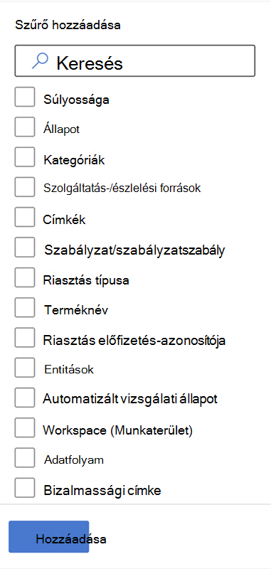 Az alapértelmezett riasztási várólistán a Szűrő lehetőséget választva megtekintheti az összes elérhető szűrőt, amelyből megadhatja a riasztások egy részhalmazát. Íme egy példa.