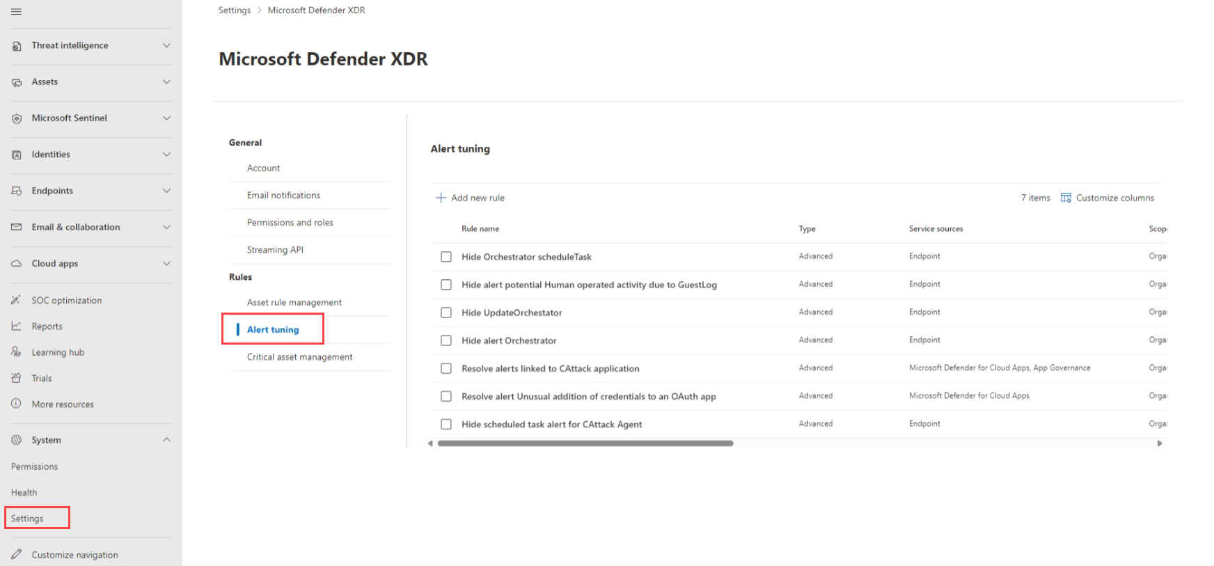 A Microsoft Defender portálon válassza a Beállítások > Microsoft Defender XDR > Riasztás finomhangolása lehetőséget.