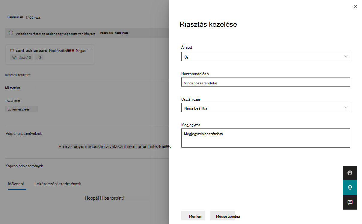 A részletek lapon a kiválasztott riasztás részletei láthatók, a hozzá kapcsolódó részletekkel és műveletekkel együtt. Ha kiválasztja a riasztási történet érintett eszközeit vagy entitásait, a részletek lapja megváltozik, hogy környezeti információkat és műveleteket biztosítson a kiválasztott objektumhoz.