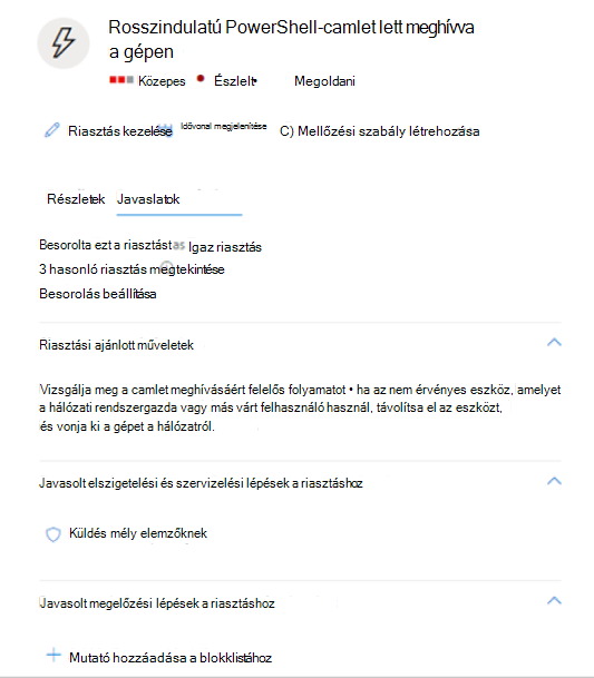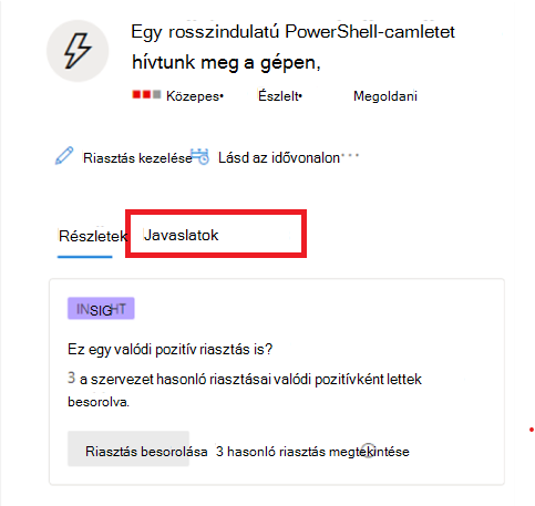 Ha a korábbiakban már besoroltak hasonló riasztásokat, időt takaríthat meg, ha Microsoft Defender XDR javaslatokat használva megtudhatja, hogyan oldották meg a többi riasztást. Az összefoglalás részletei szakaszban válassza a Javaslatok lehetőséget.