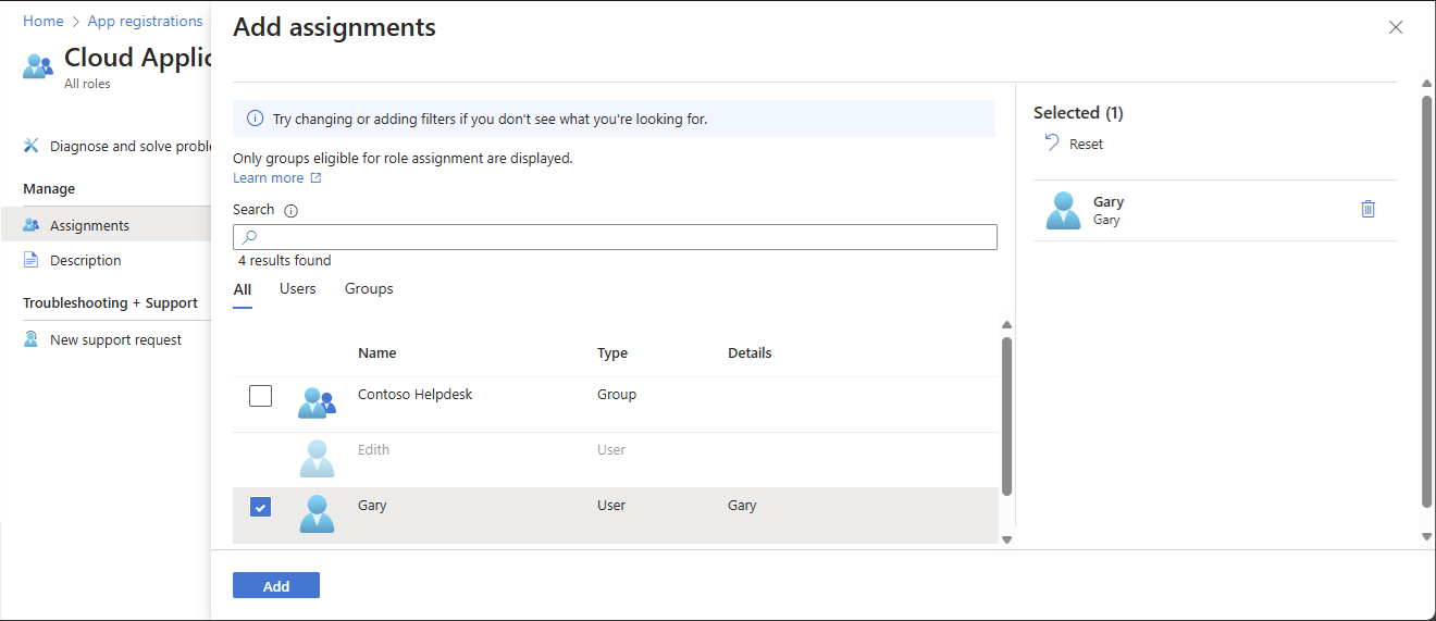 Válassza a Hozzáadás lehetőséget az alkalmazásregisztráció hatókörébe tartozó szerepkör hozzárendeléséhez.