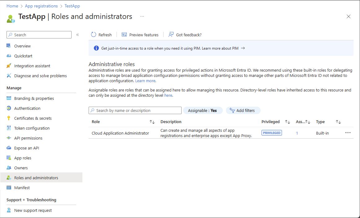 Ha a felhasználói élmény eltér az alábbi képernyőképen láthatótól, előfordulhat, hogy a Microsoft Entra P2-azonosítójával és PIM-jával rendelkezik. További információ: Microsoft Entra-szerepkörök hozzárendelése a Privileged Identity Managementben.