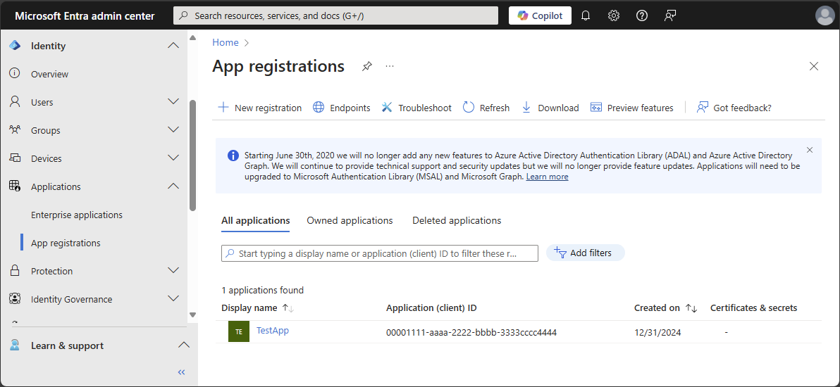 Keresse meg az Entra-azonosítós>alkalmazásregisztrációkat.
