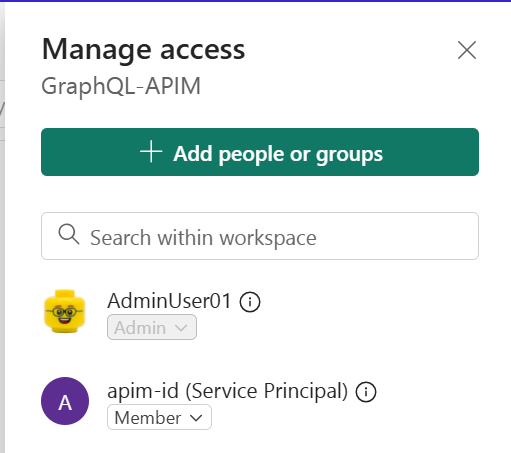 A felügyelt identitás létrehozása után engedélyt kell adnia neki a Fabric-erőforrások eléréséhez. A felügyelt identitásnak hozzá kell férnie a GraphQL API-elemhez és minden olyan adatforráshoz, amelyhez csatlakozik (például tóházakhoz vagy raktárakhoz). Az identitás munkaterület-tagként való hozzáadása a legegyszerűbb módszer, mivel egyszerre biztosít hozzáférést a munkaterület összes eleméhez.