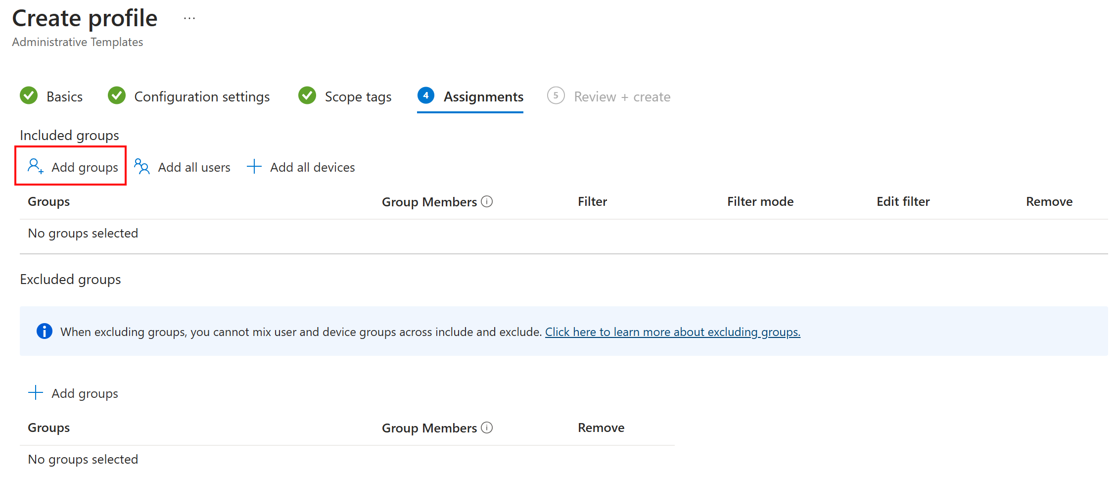 A hozzárendelések megadása nem kötelező, és ez a példa nem használja őket. Éles környezetben válassza a Csoportok hozzáadása lehetőséget. Válasszon ki egy Microsoft Entra csoportot, amely tartalmazza azokat a felhasználókat vagy eszközöket, amelyeknek meg kell kapniuk ezt a szabályzatot. A szabályzatok hozzárendelésével kapcsolatos információkért és útmutatásért lásd: Felhasználói és eszközprofilok hozzárendelése az Intune-ban.