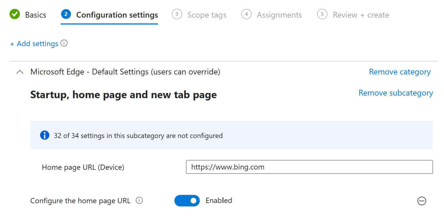 Zárja be a beállításválasztót. Állítsa a Kezdőlap URL-címének konfigurálása beállítást Engedélyezve értékre, és állítsa az értékét egy URL-címre, például