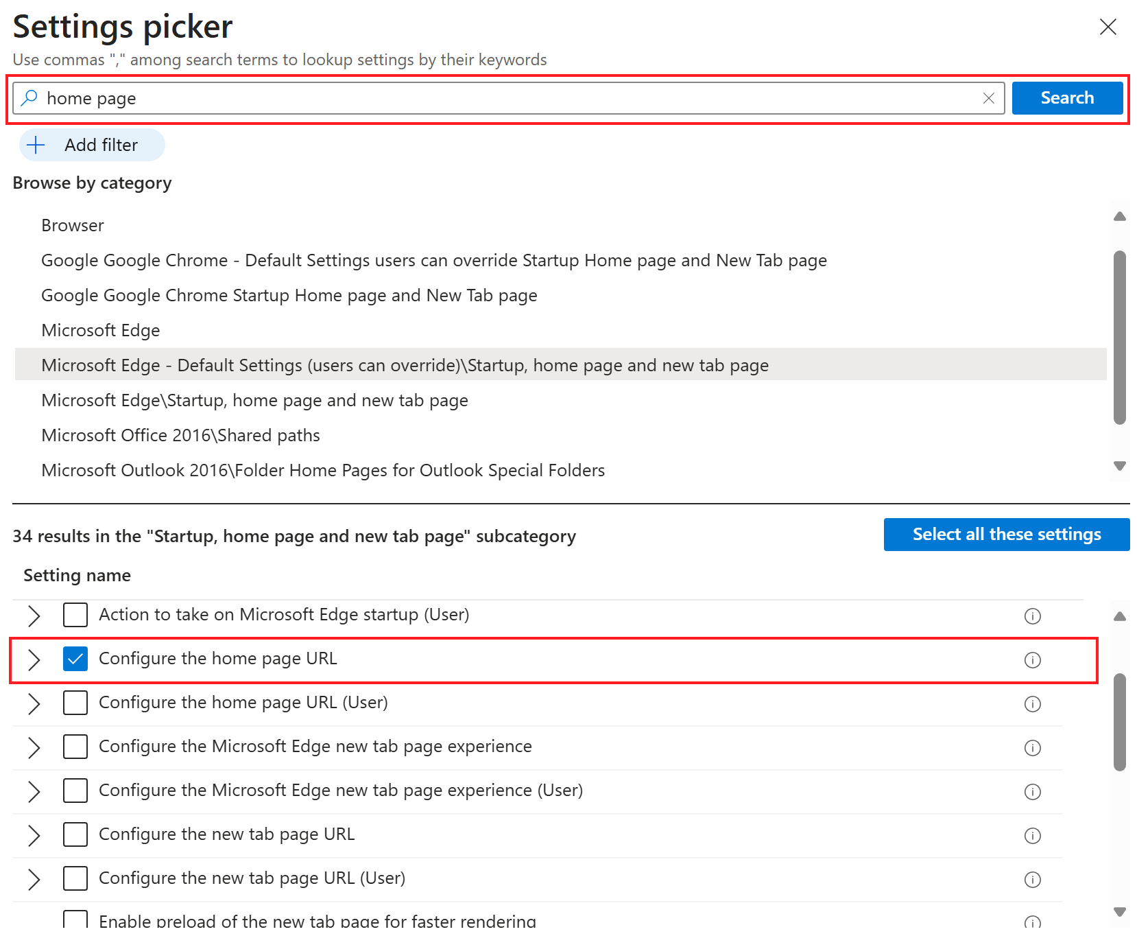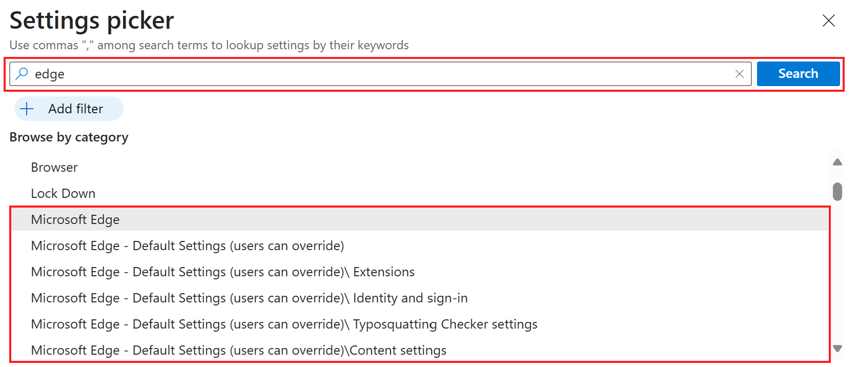 Ez a szakasz bemutatja, hogyan hozhat létre, kereshet és konfigurálhat Microsoft Edge-beállításokat a beállításkatalógus használatával.