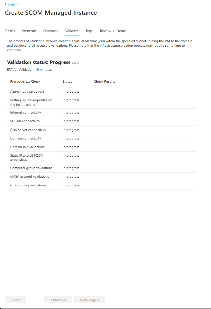 A Véleményezés + létrehozás csoportban tekintse át az eddig megadott összes bemenetet, majd válassza a Létrehozás lehetőséget. Az üzembe helyezés az Azure-ban jön létre. A felügyelt SCOM-példány létrehozása akár egy órát is igénybe vehet.