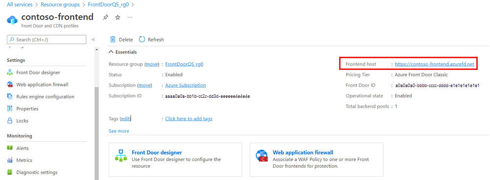 Keresse meg az erőforráscsoport FrontDoorQS_rg0 , és válassza ki a Front Door szolgáltatást.