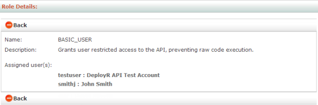 Users are granted permissions to perform operations on the DeployR Web services API by the role(s) assigned to them. Having clearly defined roles in this console simplifies the process of granting permissions to new or existing users.