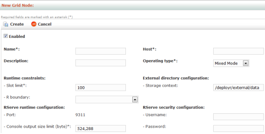 $DEPLOYR_HOME/deployr/external/datawhere$DEPLOYR_HOMEis the installation directory.Click Create to save the new node. The node configuration is validated. If the configuration works, then it is saved. If not, an error message will appear.