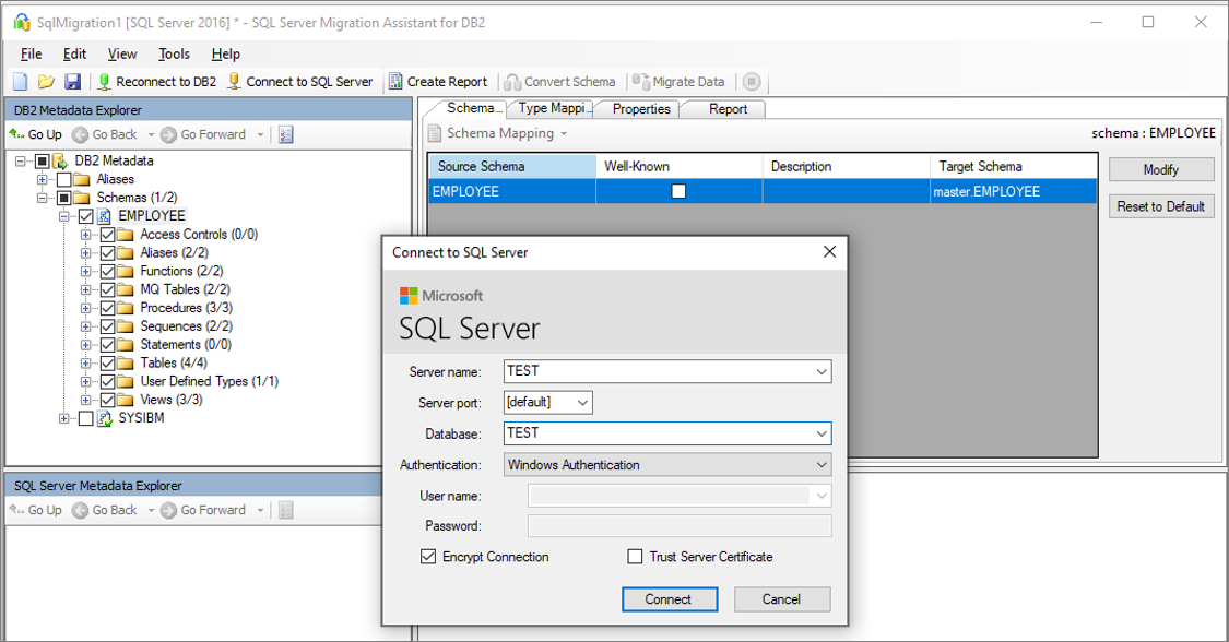 Adja meg a db2- és AZ SQL Server-példányok kapcsolati adatait.