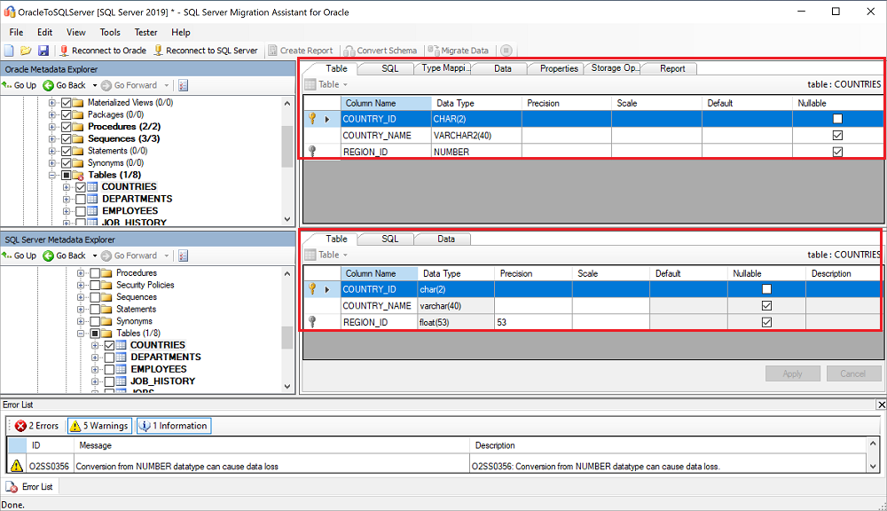Az egyes táblák típusleképezését az Oracle Metadata Explorer panelen található táblanév kiválasztásával módosíthatja.