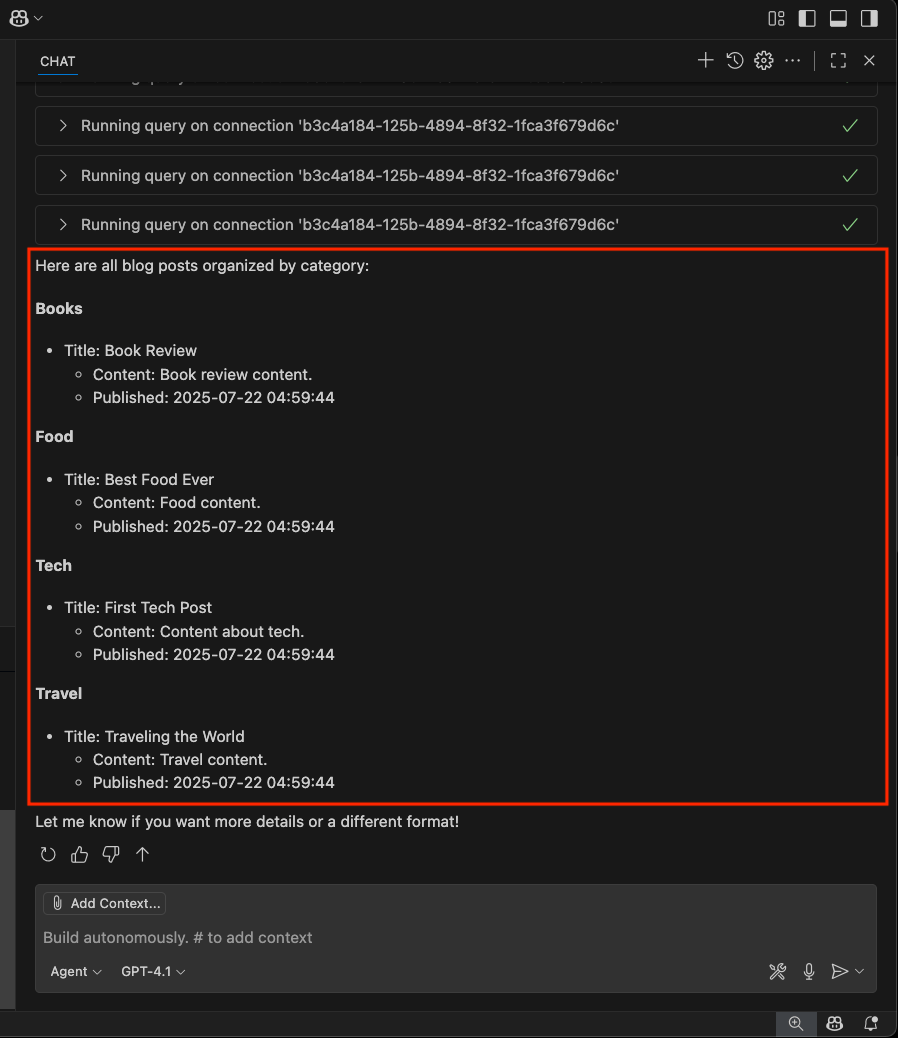 Az Ügynök mód lehetővé teszi, hogy a GitHub Copilot a Visual Studio Code MSSQL-bővítményében elérhető eszközöket használja. A bővítmény telepítésekor és aktív állapotában a Copilot felsorolhatja az SQL Server-kapcsolatokat, csatlakozhat egy kiszolgálóhoz és adatbázishoz, és lekérheti az adatbázis metaadatait.