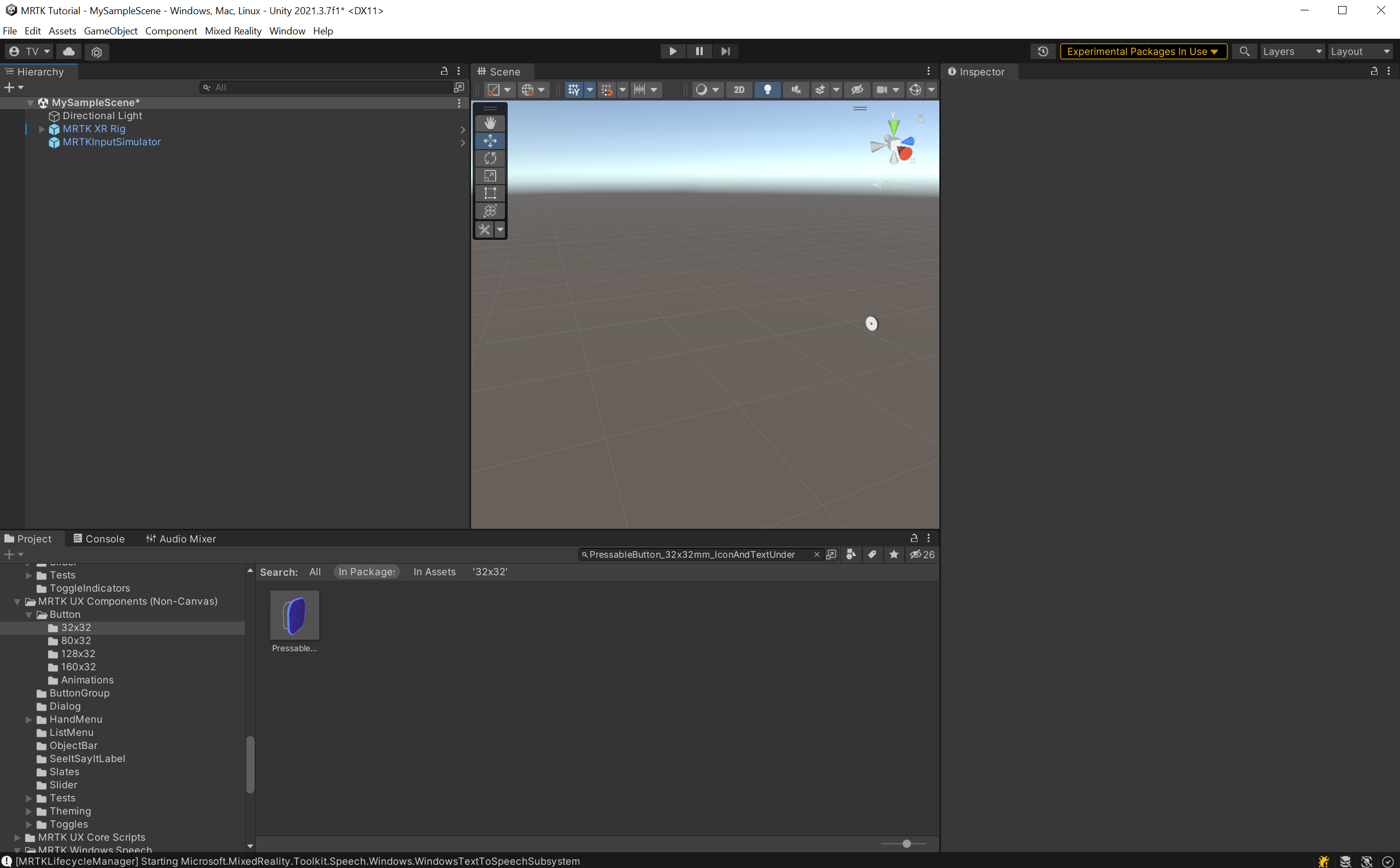 A Gomb prefab hozzáadásához a Projekt ablakban válassza a Csomagok lehetőséget, majd írja be a keresősávba a "PressableButton_32x32mm_IconAndTextUnder" kifejezést.