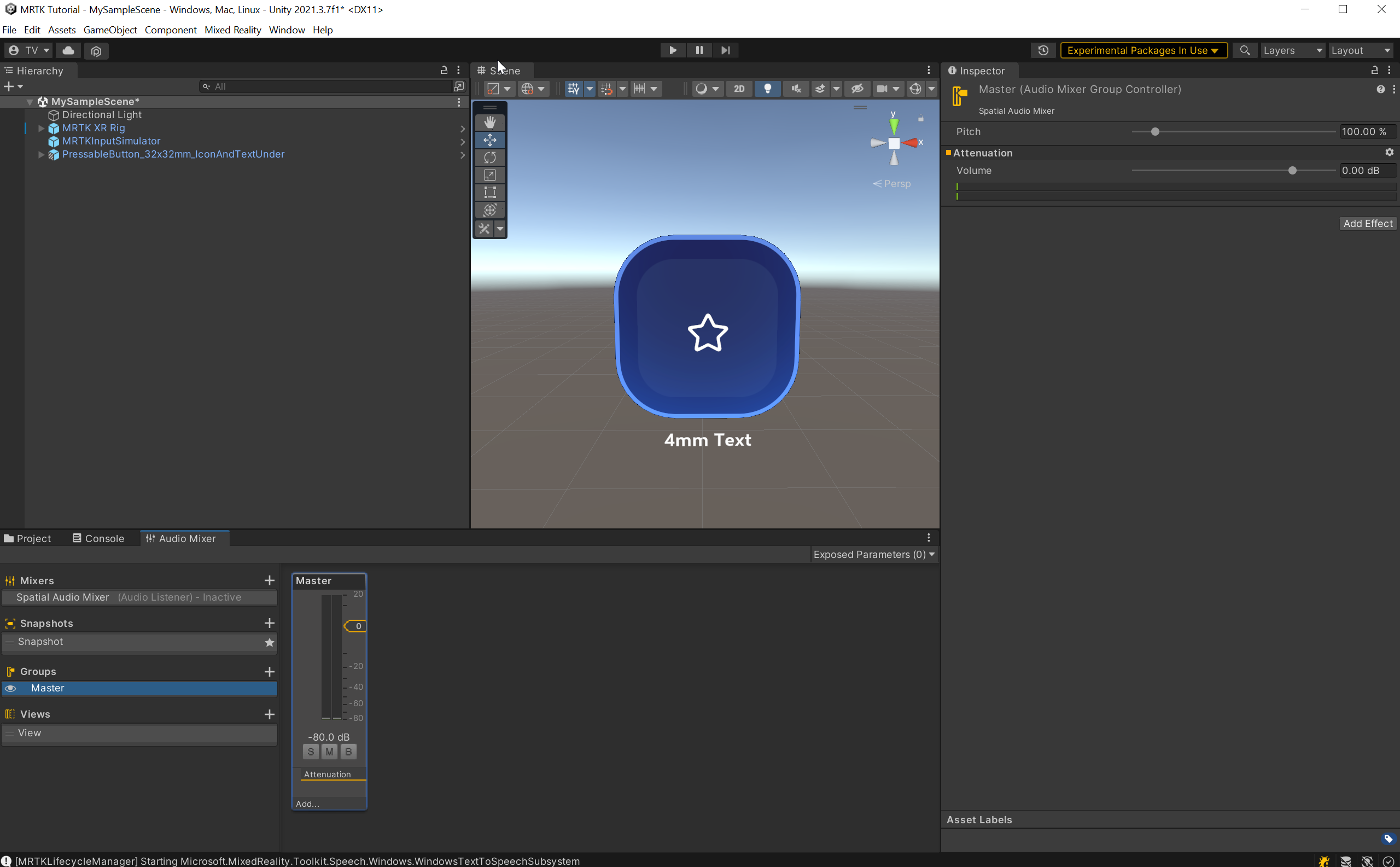 Ebben a leckében megtanulhatja, hogyan térítheti el a gomb interakciós hangjait, és megtudhatja, hogyan használhat hangklipet a térbeli gomb interakciójának teszteléséhez.