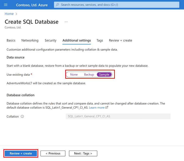 Pada tab Pengaturan tambahan, di bagian Sumber data, untuk Menggunakan data yang sudah ada, pilih Sampel. Ini membuat database sampel AdventureWorksLT sehingga ada beberapa tabel dan data untuk dikueri dan bereksperimen dengan, dibandingkan dengan database kosong.