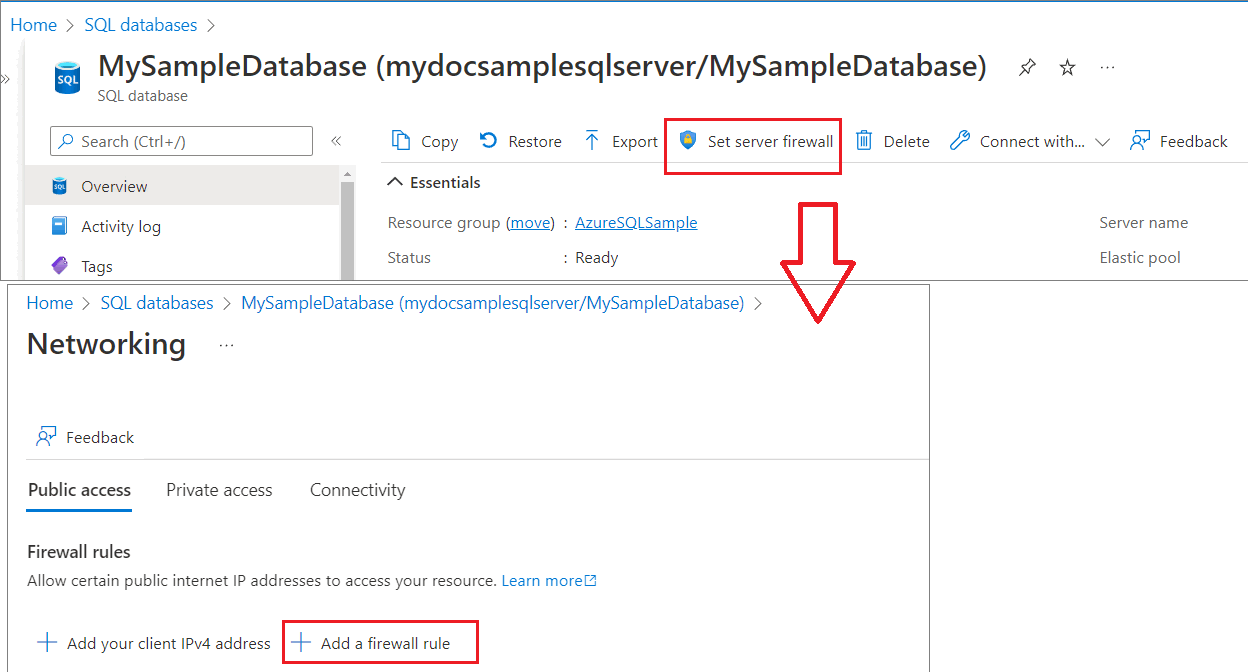 Untuk mengelola database yang ada, navigasi ke halaman database SQL dan pilih database yang ingin Anda kelola. Tangkapan layar berikut menunjukkan cara memulai pengaturan firewall tingkat server untuk database dari halaman Ikhtisar.