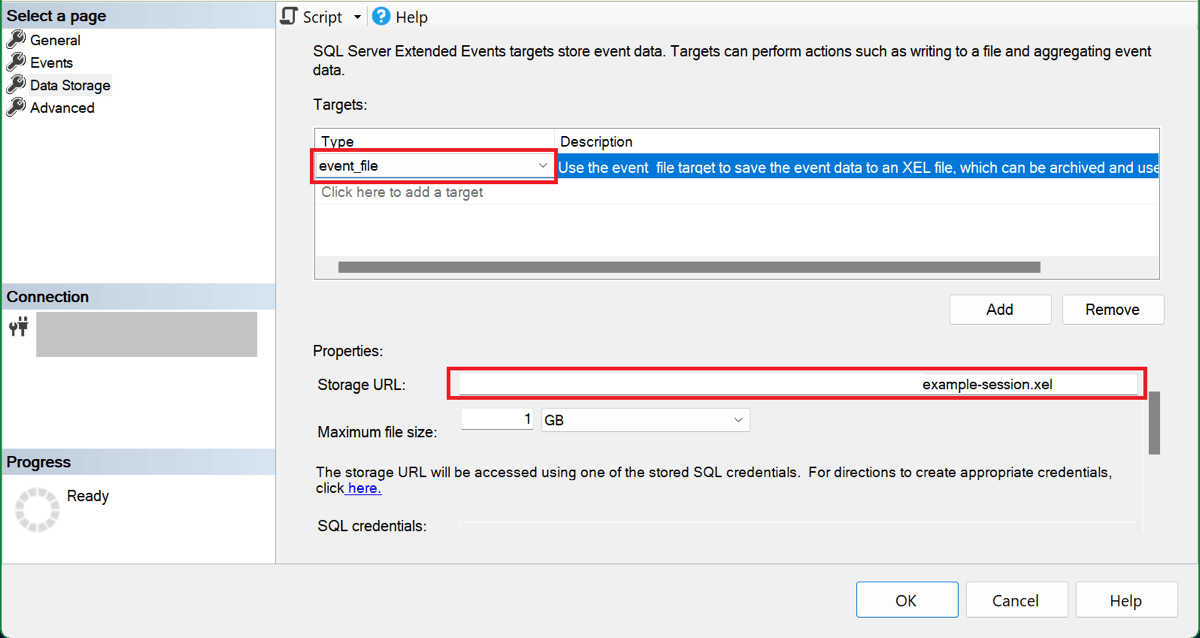 event_filesebagai jenis target, dan tempelkan URL kontainer penyimpanan di kotak URL Penyimpanan. Ketik garis miring (/) di akhir URL ini, diikuti dengan nama file (blob). Dalam contoh kami, nama blob adalahexample-session.xel, dan seluruh URL adalahhttps://<storage-account-name>.blob.core.windows.net/<container-name>/example-session.xel.Note