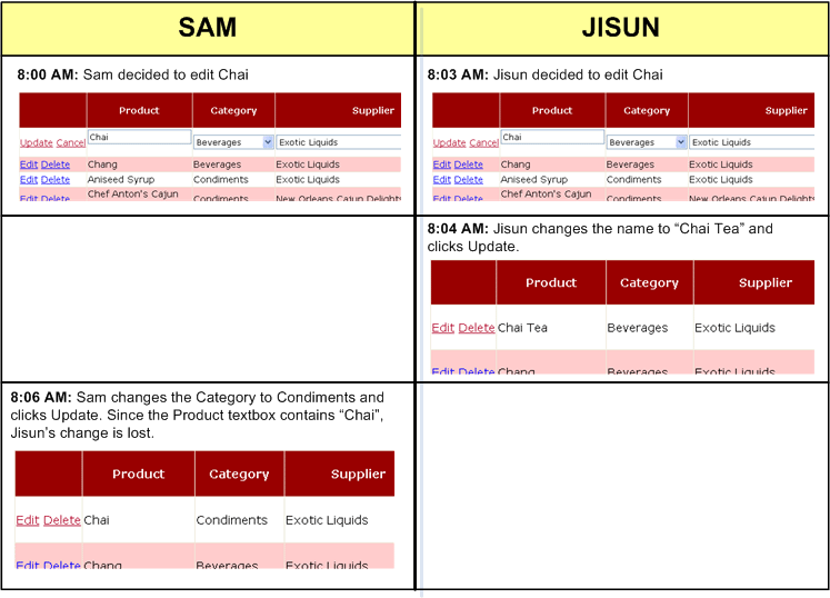 Bayangkan bahwa dua pengguna, Jisun dan Sam, keduanya mengunjungi halaman dalam aplikasi yang memungkinkan pengunjung untuk memperbarui dan menghapus produk melalui kontrol GridView. Keduanya mengklik tombol Edit untuk Chai sekitar waktu yang sama. Jisun mengubah nama produk menjadi Teh Chai dan mengklik tombol Perbarui. Hasil bersih adalah UPDATE pernyataan yang dikirim ke database, yang mengatur semua bidang produk yang dapat diperbarui (meskipun Jisun hanya memperbarui satu bidang, ProductName). Pada titik waktu ini, database memiliki nilai Chai Tea, kategori Minuman, pemasok Exotic Liquids, dan sebagainya untuk produk khusus ini. Namun, layar GridView di Sam s masih menampilkan nama produk di baris GridView yang dapat diedit sebagai Chai. Beberapa detik setelah perubahan Jisun diterapkan, Sam memperbarui kategori menjadi Bahan Pelengkap dan mengklik tombol Perbarui. Ini menghasilkan pernyataan UPDATE yang dikirim ke database, menetapkan nama produk menjadi Chai dan CategoryID ke ID kategori bumbu yang sesuai, dan sebagainya. Perubahan Jisun pada nama produk telah digantikan.