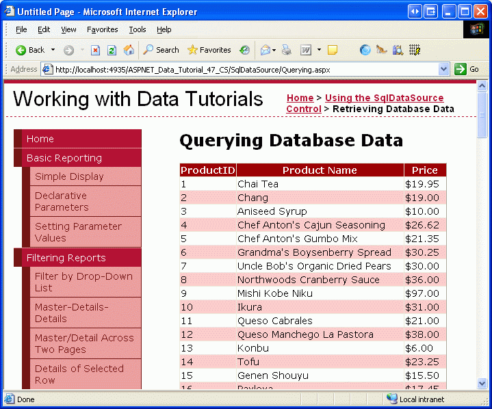 Default.aspxQuerying.aspxParameterizedQueries.aspxInsertUpdateDelete.aspxOptimisticConcurrency.aspx