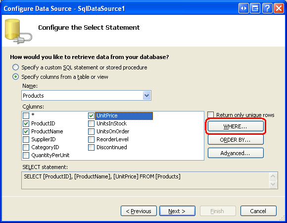 Setelah menambahkan parameter, klik OK untuk kembali ke wizard Konfigurasikan Sumber Data. Pernyataan SELECT di bagian bawah wizard sekarang harus menyertakan WHERE klausa dengan parameter bernama @UnitPrice: