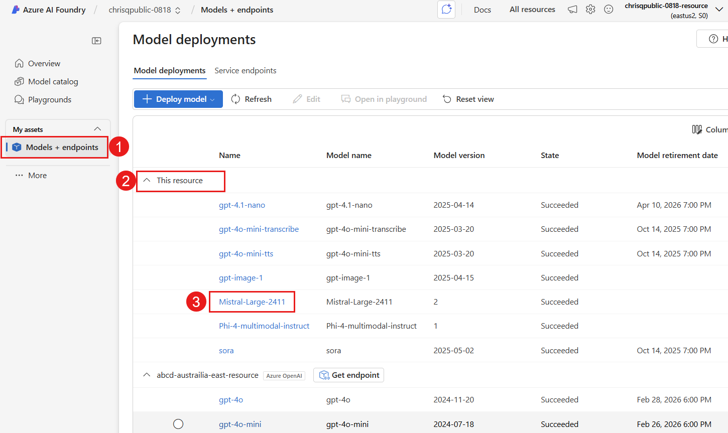 Setelah penyebaran selesai, Anda mendarat di Foundry Playgrounds tempat Anda dapat menguji model secara interaktif. Proyek dan sumber daya Anda harus berada di salah satu wilayah penyebaran yang didukung untuk model. Verifikasi bahwa status penyebaran menunjukkan Berhasil dalam daftar penyebaran Anda.