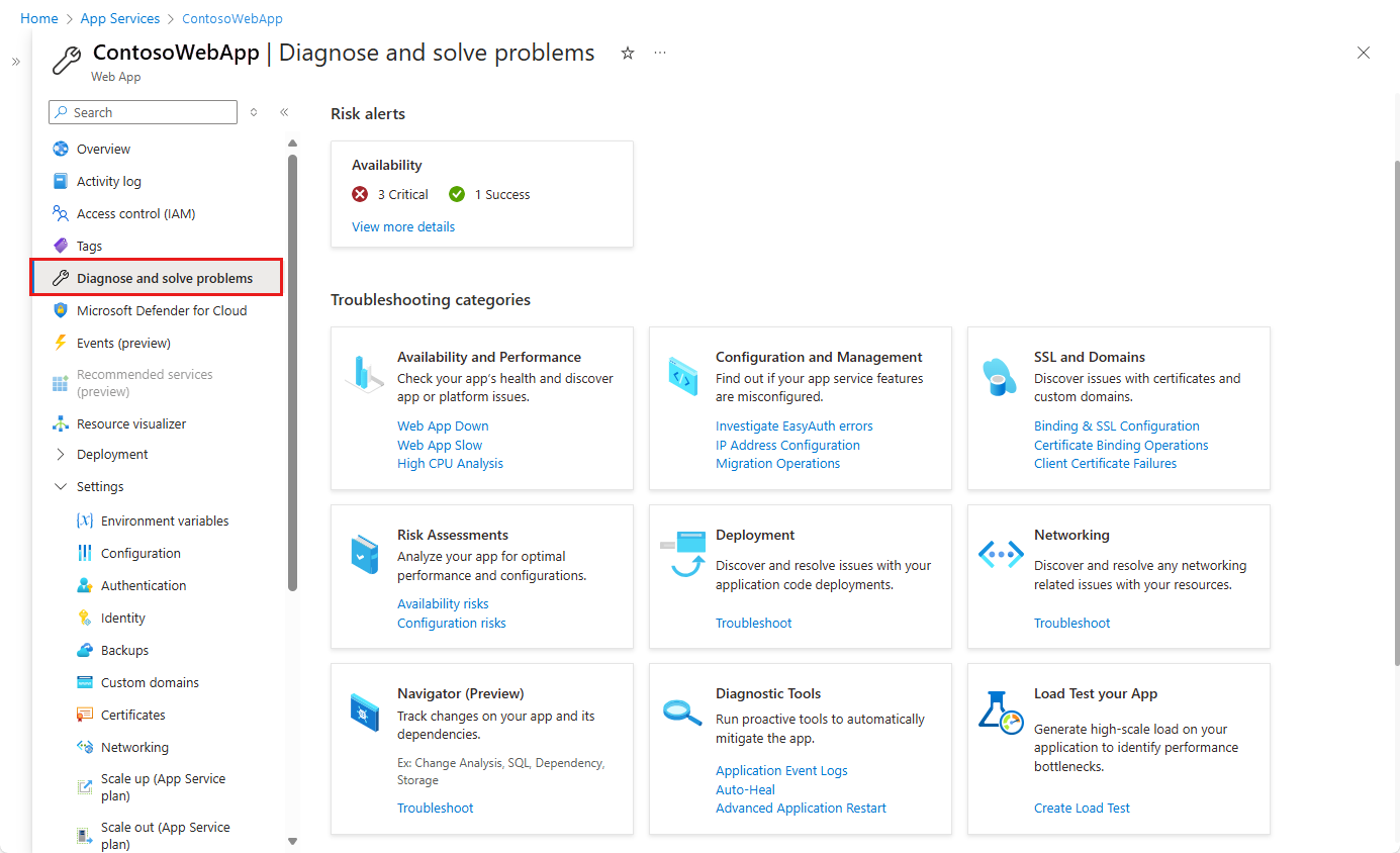 Halaman diagnostik App Service menyediakan banyak alat untuk mendiagnosis masalah aplikasi. Untuk informasi selengkapnya, lihat Alat diagnostik nanti di artikel ini.