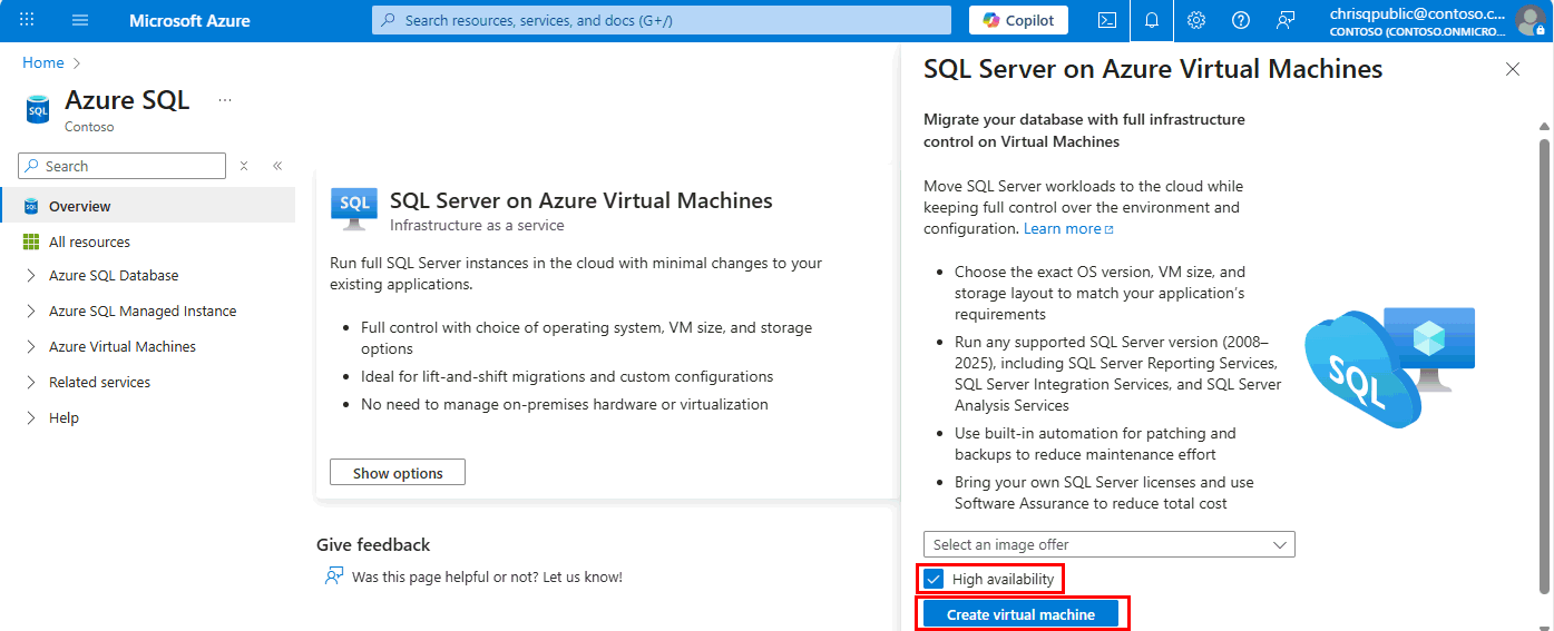 Di bawah Mesin virtual SQL, pilih kotak centang ketersediaan tinggi.