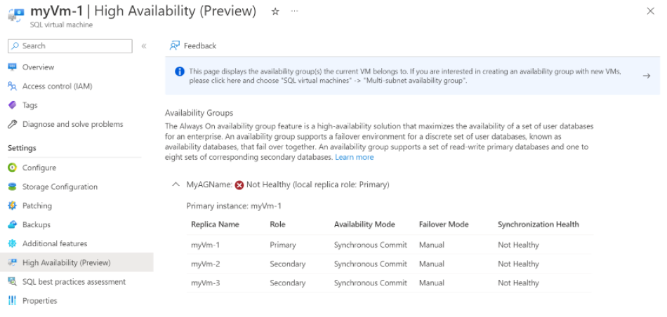 Sinkronisasi Kesehatan pada halaman Ketersediaan Tinggi portal Azure memperlihatkan Tidak Dalam Kondisi Sehat hingga Anda menambahkan database ke grup ketersediaan Anda.