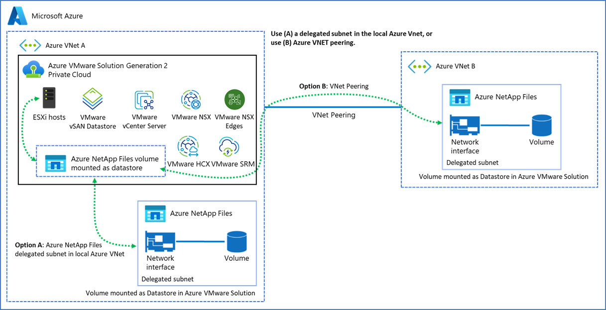 - Gen 2: Untuk menyebarkan cloud privat Azure VMware Solution Gen 2 , gunakan subnet di jaringan virtual yang disediakan sebagai bagian dari proses penyebaran atau gunakan subnet di jaringan virtual khusus untuk Azure NetApp Files yang di-peering dengan jaringan virtual cloud privat.