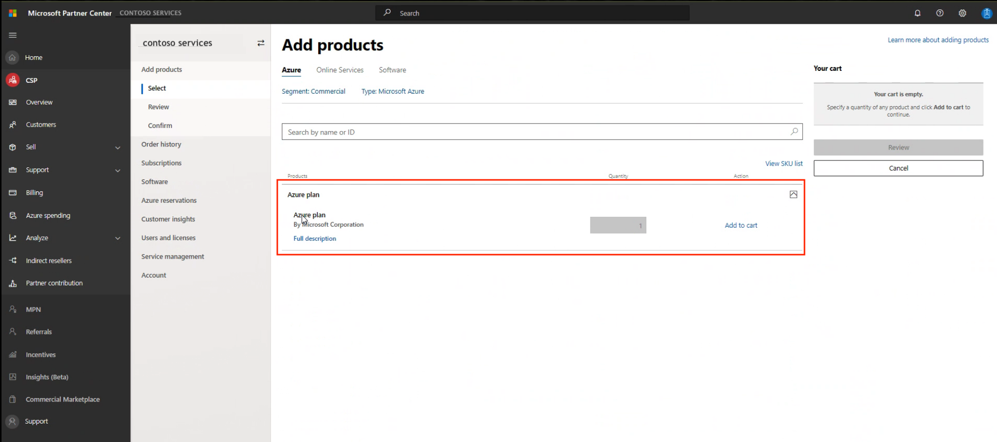 Pilih paket Azure lalu pilih Tambahkan ke keranjang.