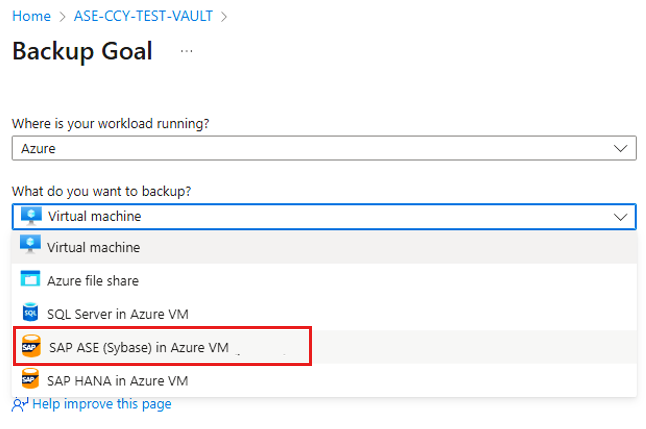 Pada Tujuan Pencadangan, pilih SAP ASE (Sybase) di Azure VM sebagai jenis sumber data.