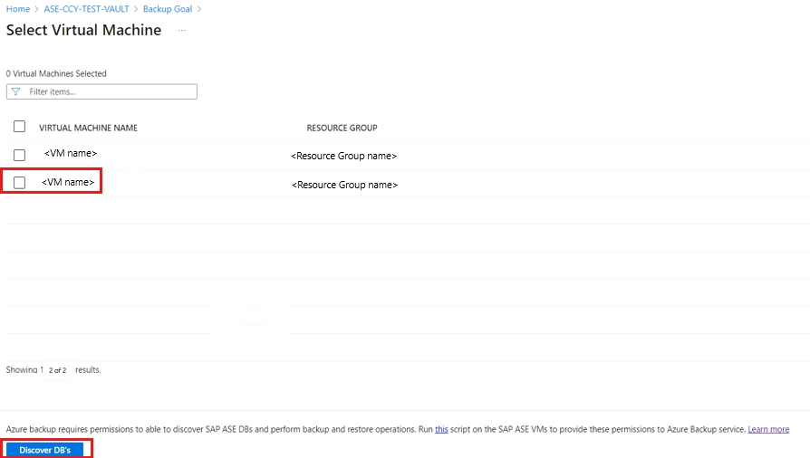 Pada panel Pilih Komputer Virtual , unduh skrip prepost yang menyediakan izin untuk layanan Azure Backup untuk mengakses VM SAP ASE untuk penemuan database.