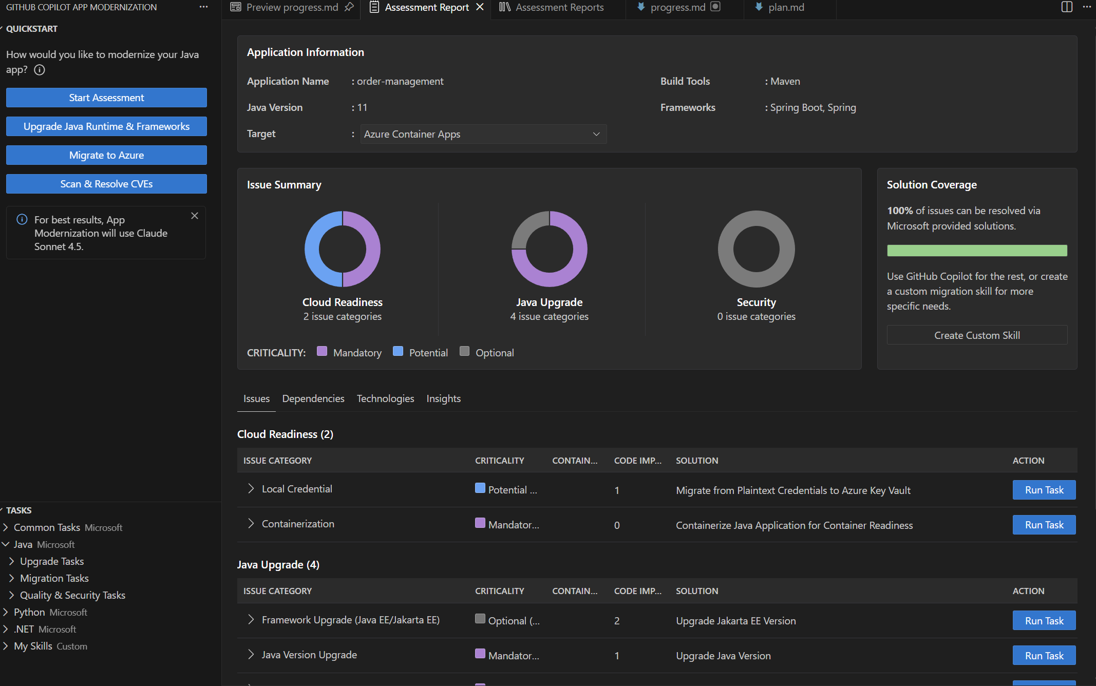 Setelah Anda menyelesaikan penilaian, perbaiki masalah yang diidentifikasi dengan menggunakan tugas yang telah ditentukan atau kustom. Modernisasi aplikasi GitHub Copilot menyediakan dua pendekatan: tugas yang telah ditentukan sebelumnya yang menangani pola migrasi umum, dan tugas kustom yang Anda tentukan untuk kebutuhan spesifik organisasi Anda.