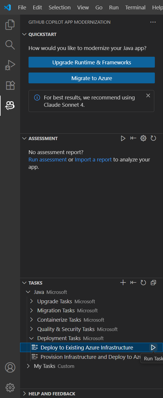 Pilih Jalankan di bagian bawah file tugas, atau temukan tugas Anda di bagian TUGAS - Tugas Saya dan pilih Jalankan Tugas. Jendela obrolan Copilot terbuka dalam Mode Agen dan secara otomatis menjalankan alur kerja migrasi.